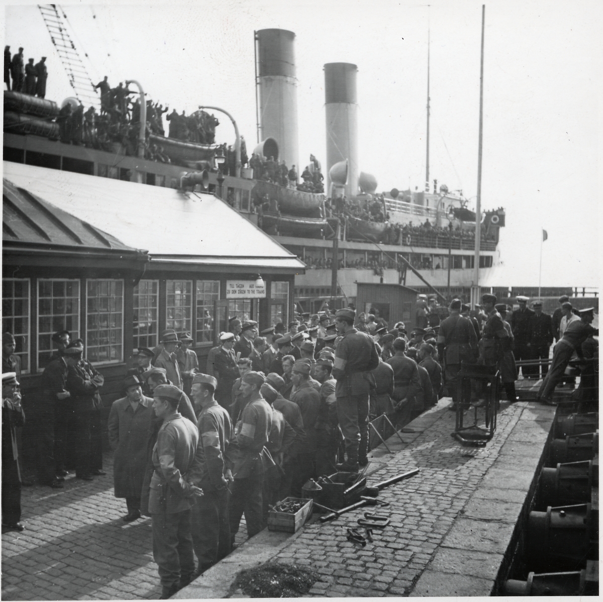 Hamnområdet i Trelleborg under krigsfångeutväxling. S/S Drottning Wictoria har lagt till med krigsfångar.