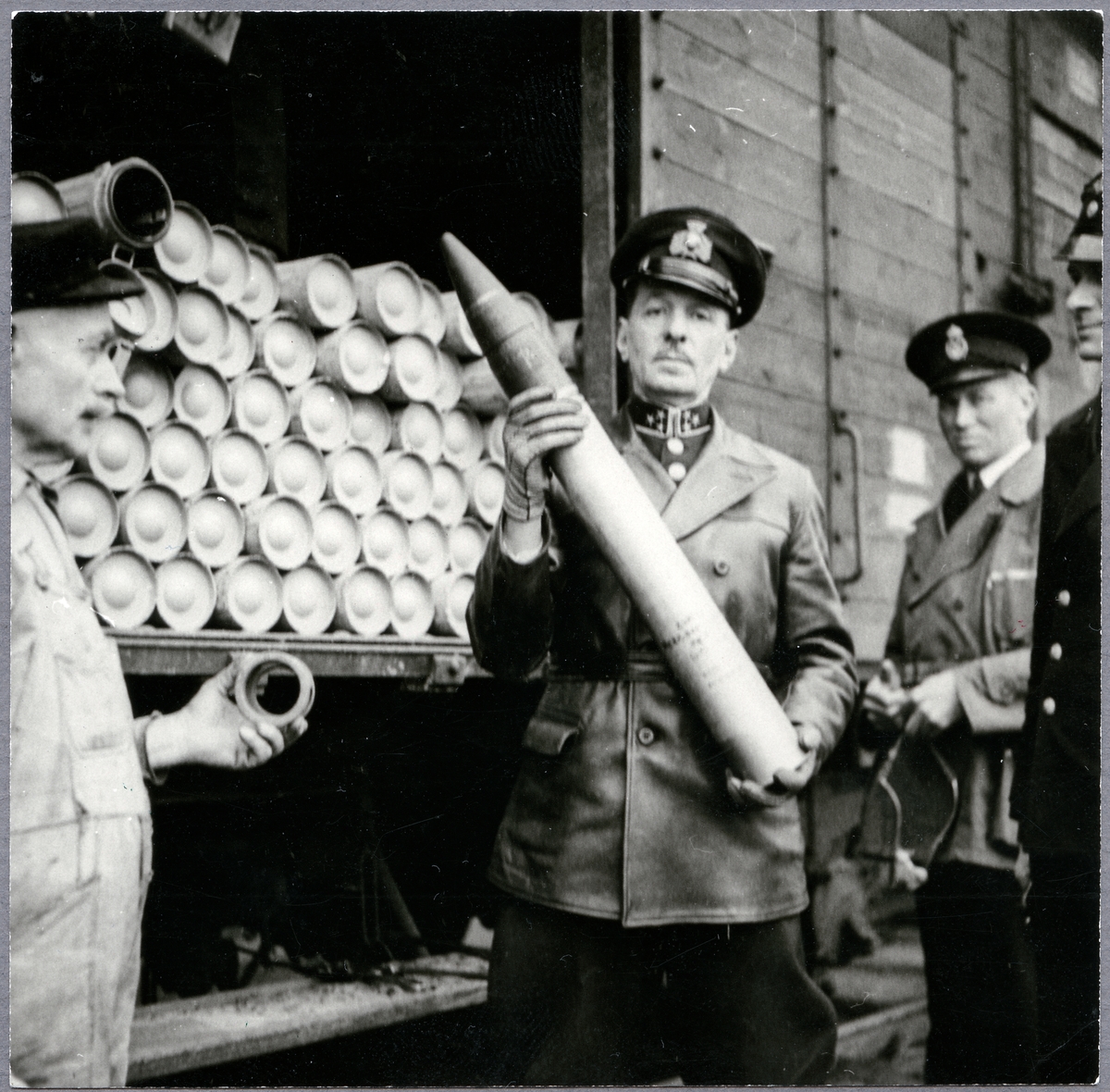 Militärer vid godsvagn lastad med granater.