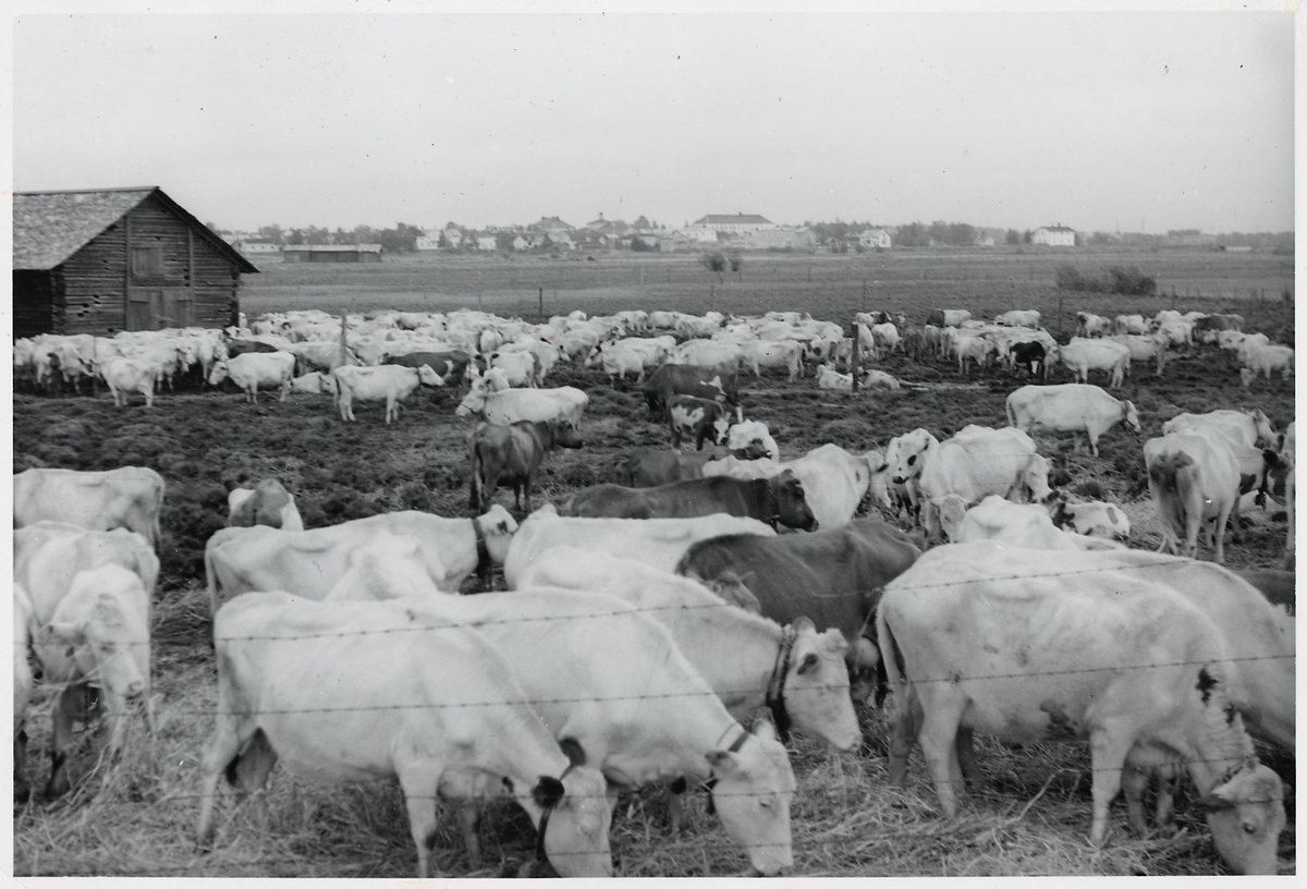 Betesfält med boskap. Bild tagen i samband med evakueringen av finska flyktingar i Haparanda, hösten 1944.