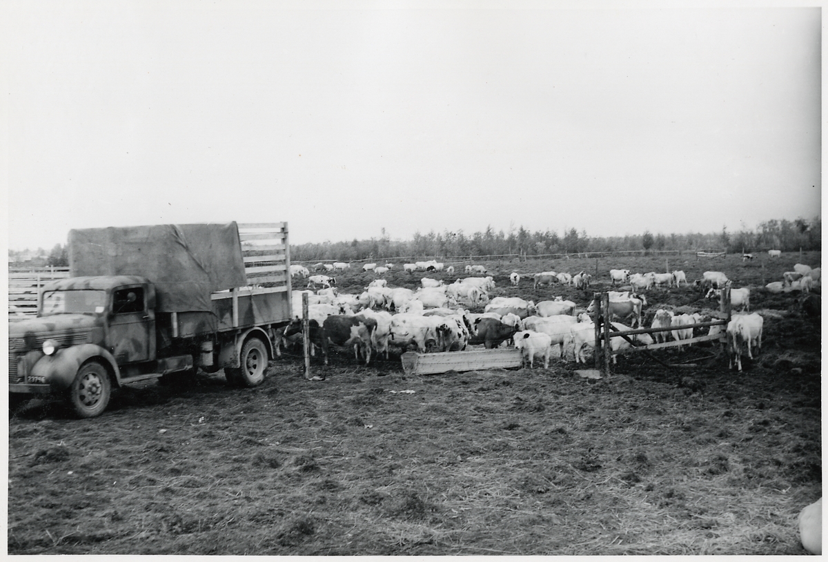 Finska flyktingar i Haparanda, hösten 1944. Betesfält med boskap. Militärfordon med registreringsnummer 23796.