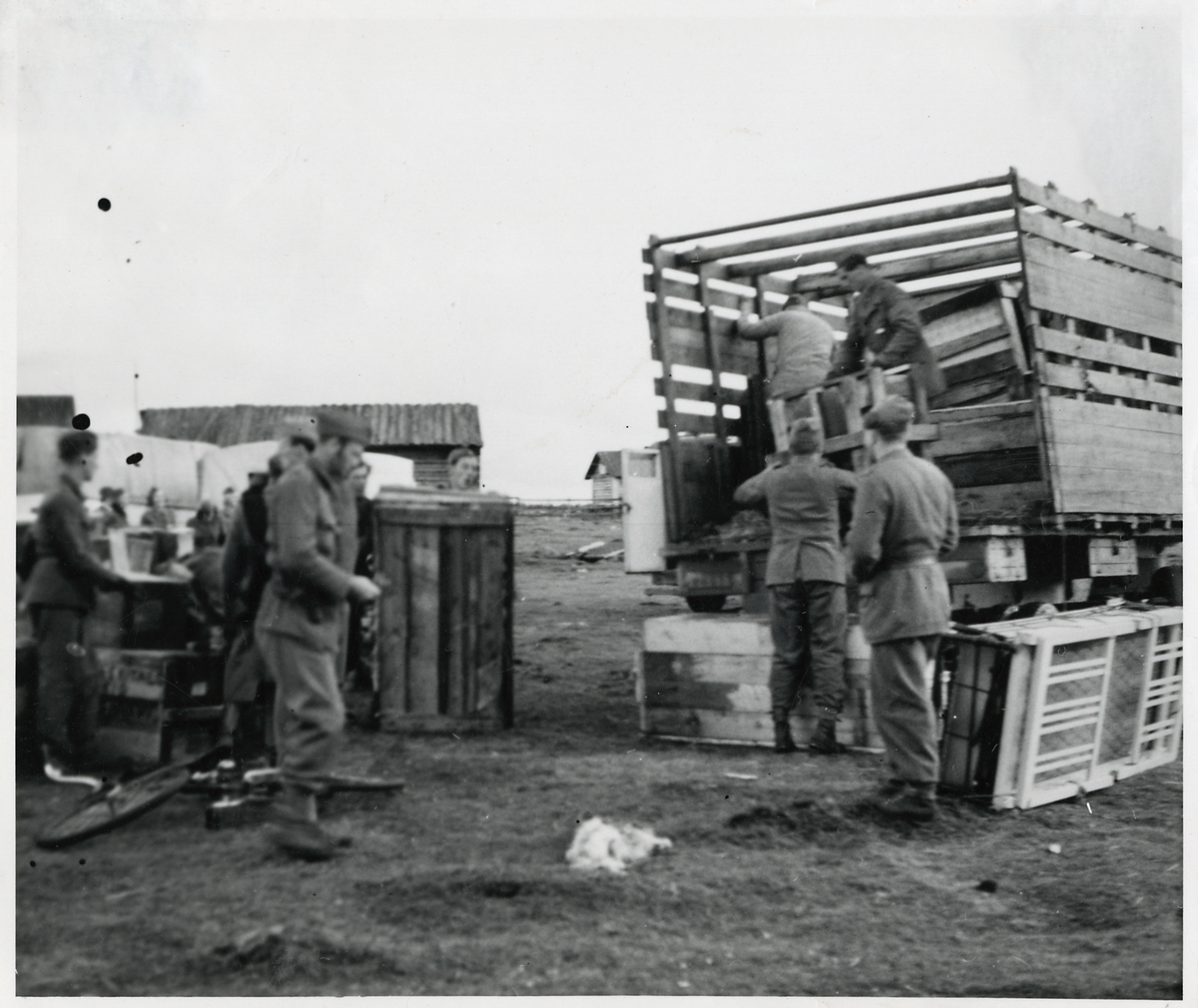 Bild tagen i samband med evakueringen av finska flyktingar i Kuttainen, hösten 1944. Lastning, lossning.