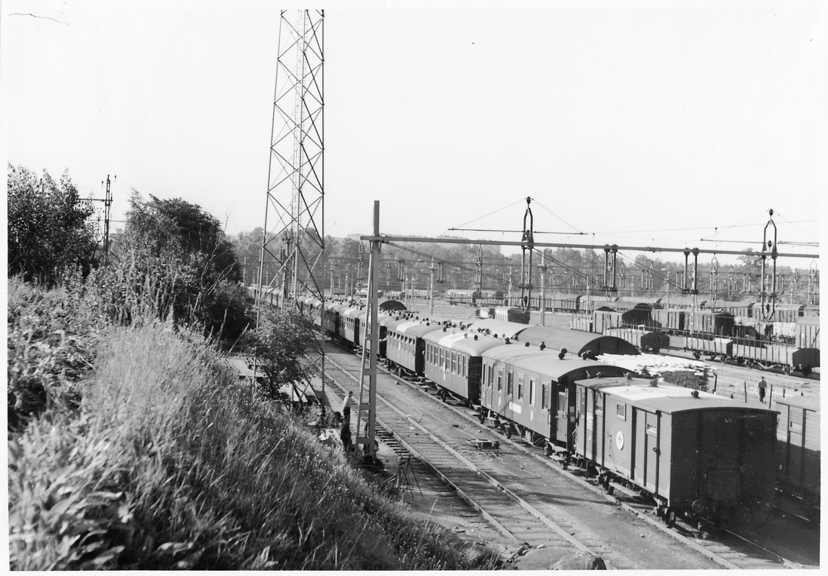 Vagnarna är från höger Statens Järnvägar, SJ F1, C10 sjukvagn och två plåtklädda C3d följda av flera C3d. Alla vagnar utom C10 märkta med ett stort rött kors på taken enligt föreskrifterna.