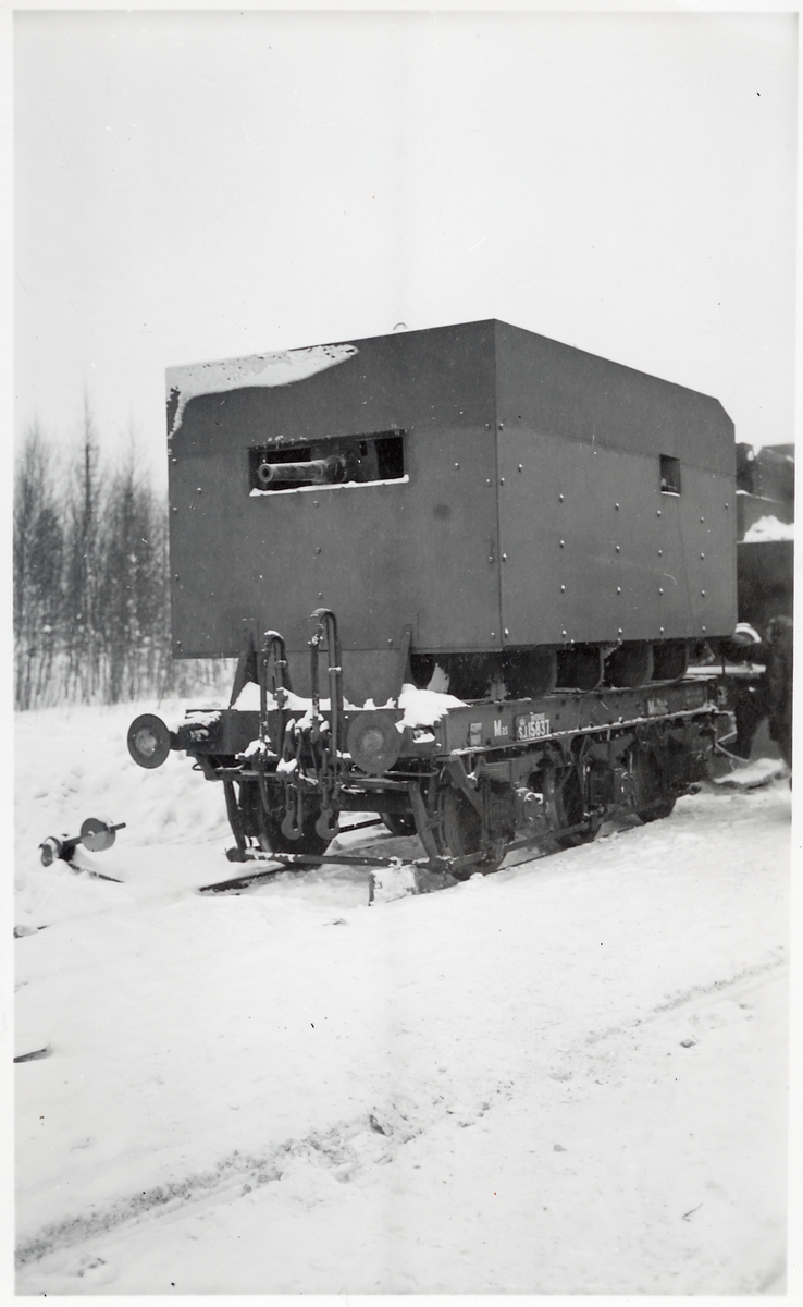 Pansartåg 2 BODEN vid Riksgränsen. Ombyggd malmvagn Statens Järnvägar, SJ Mas 15837.