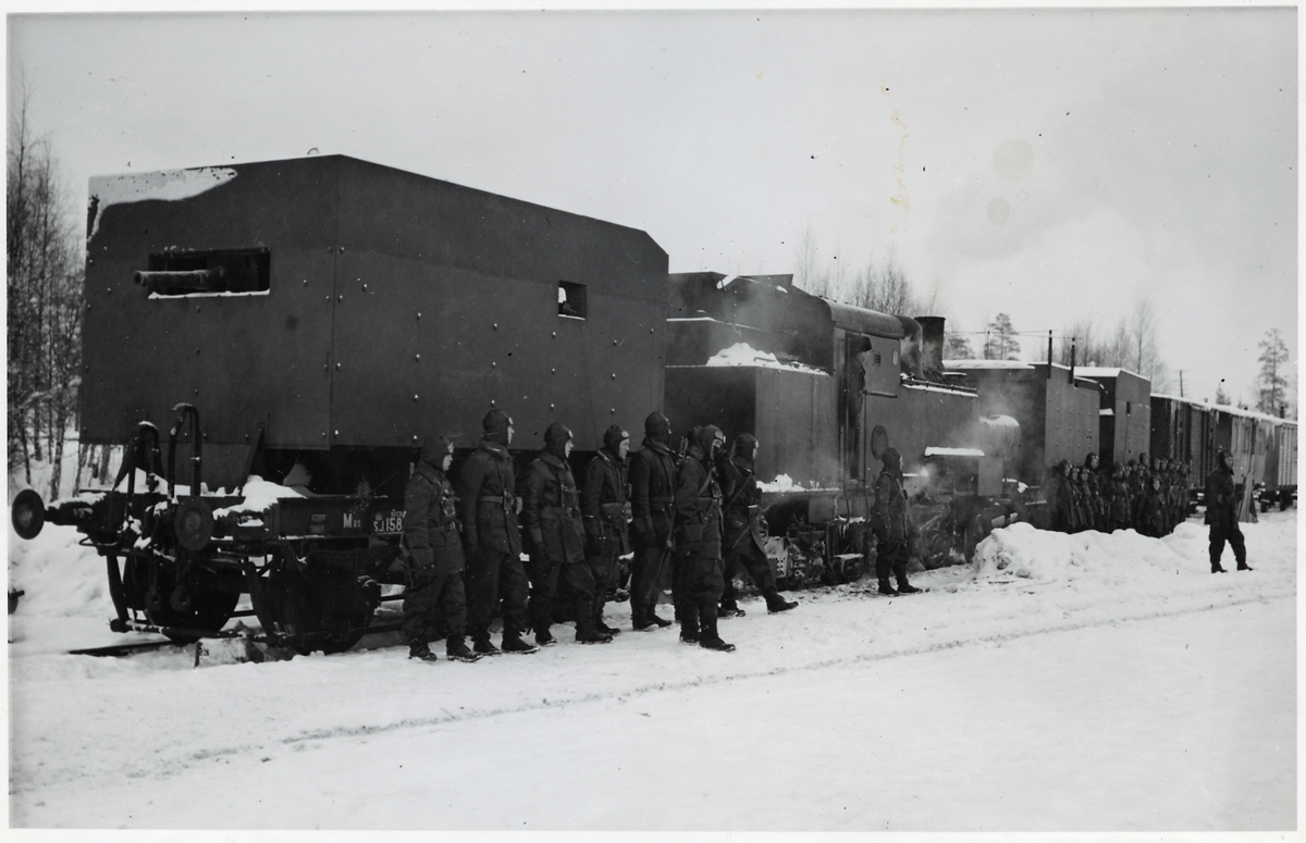 Pansartåg 2 BODEN vid Riksgränsen. Statens Järnvägar, SJ J 1390 med ombyggda malmvagnar SJ Mas 15817, SJ Mas 15837, SJ Mas 15858.