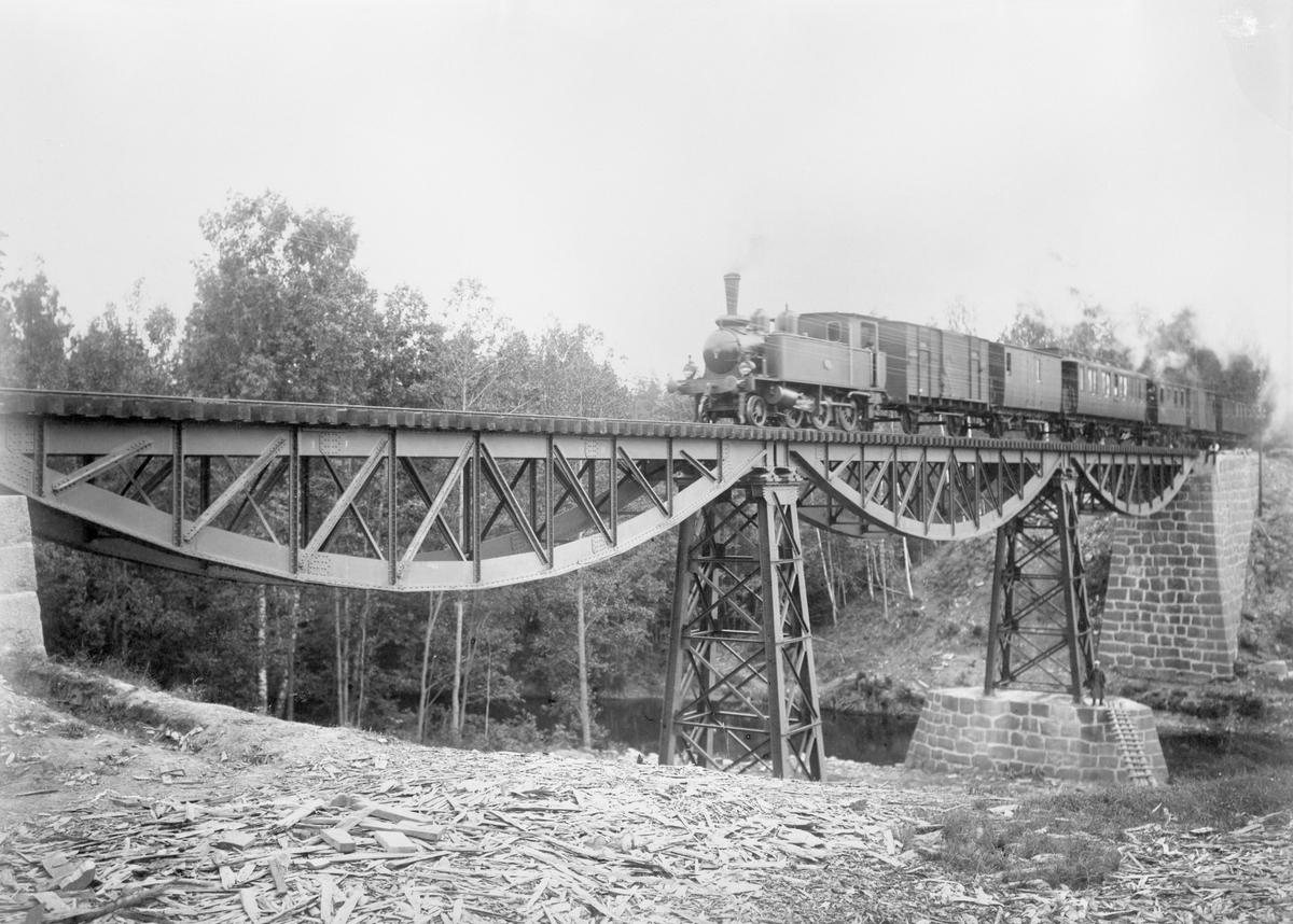 Bron över Järlaån. En man står på brofundamentet, dit han tagit sig med hjälp av en stege