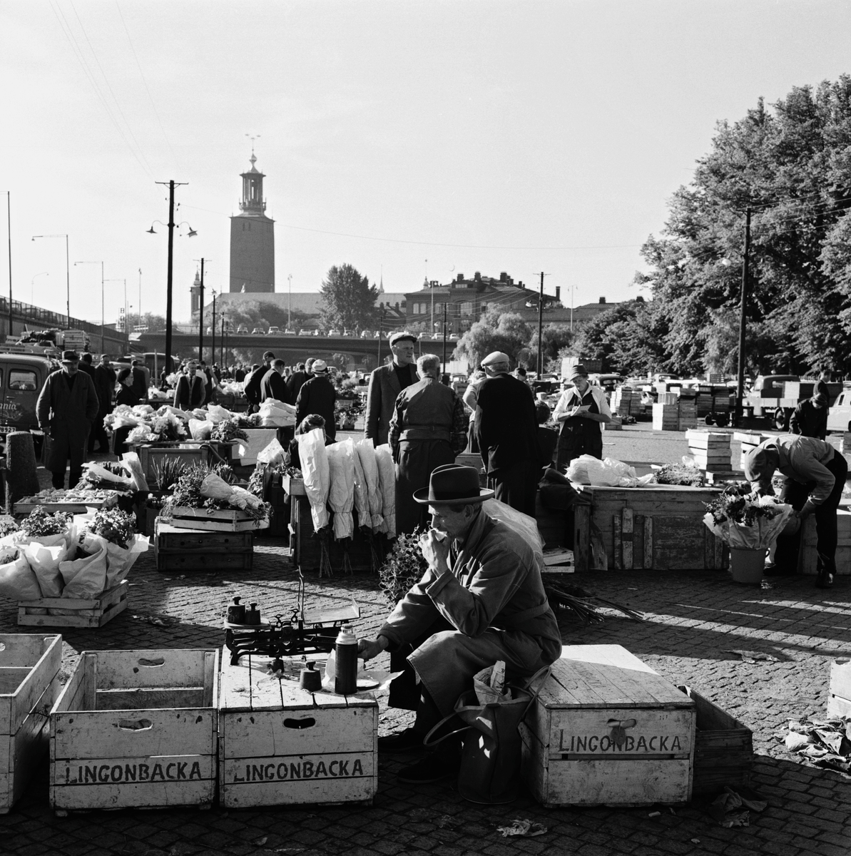 Klarahallen, salutorg. Försäljning av frukt, grönt och blommor. Stadshuset i bildend bakgrund.