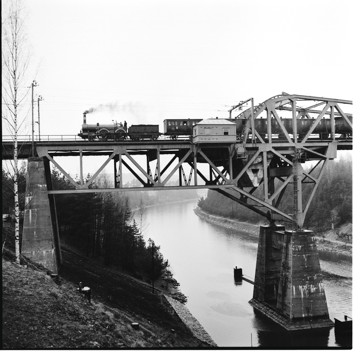 Historiska tågets resa från Stockholm till Göteborg för invigningen av Tåg 62. Sträckan Älvsjö-Södertälje. SJ B 3 "Prins August". KHJ CD 13. SJ C 182. SJ AB 289. SJ A 103. SJ C2b 329. Tåget vid passagen Södertälje Kanal bro.