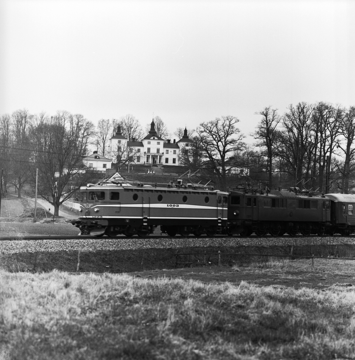 Historiska tågets resa från Stockholm till Göteborg för invigningen av Tåg 62. Sträckan Flen-Katrineholm. SJ Rb2 1003. SJ F lok. Stenhammars Slott