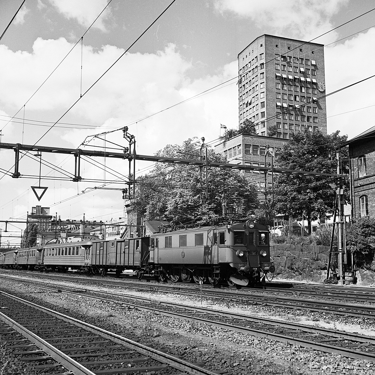 Statens Järnvägar SJ Dk 549, med resgodsvagn och passagerarvagnar kopplade vid Bonnierhuset.