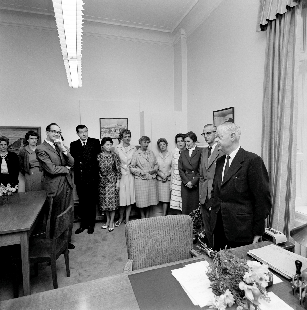 Personaluppvakting, ps. uppv. för Byråassistent, Bra, Rudolf Andersson, 2:a från höger och Byråchef, Brc, H. Siedman, Kanslibyrån, Kbr, 1:a från höger