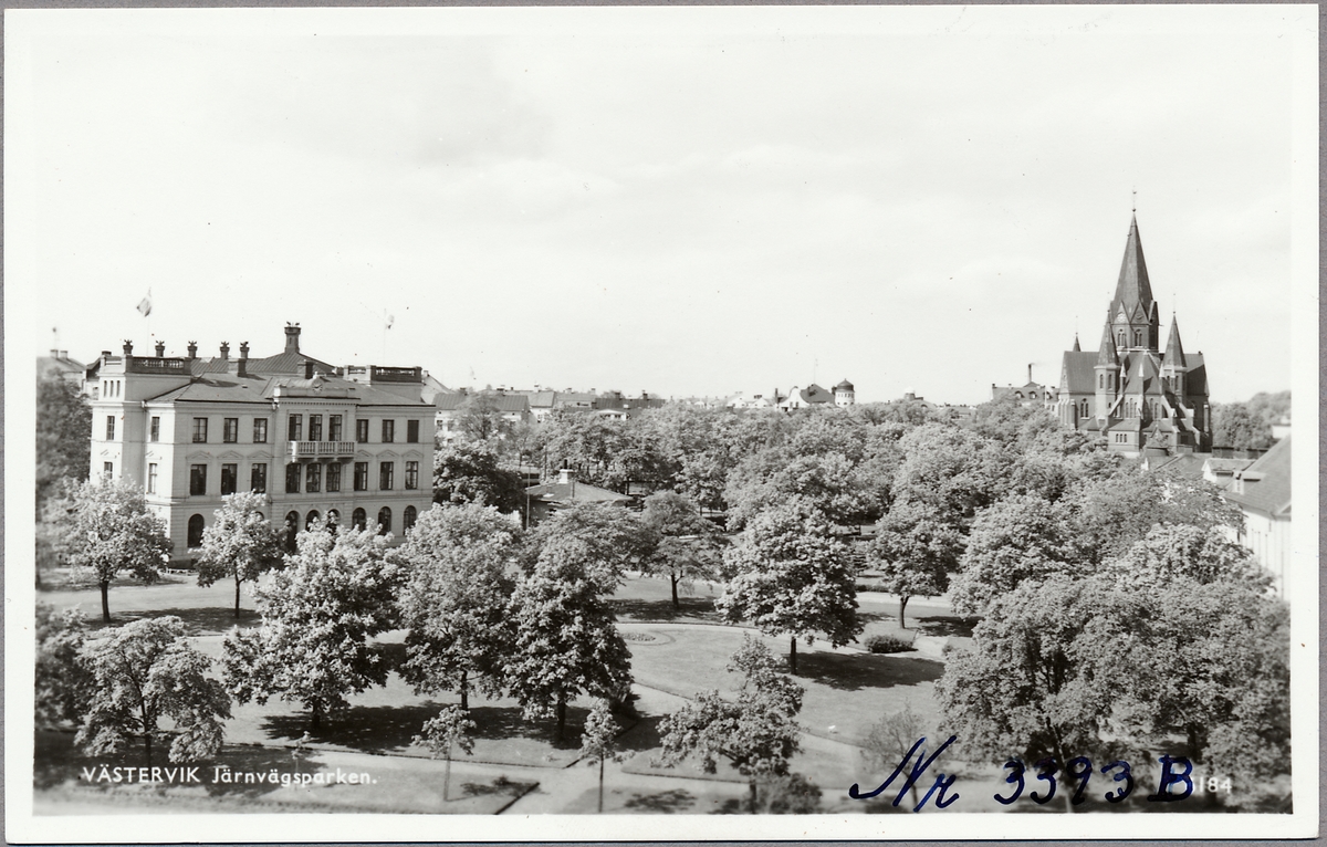 Vy över Järnvägsparken i Västervik med järnvägsstationen till vänster i bild och S:t Petri kyrka till höger.
