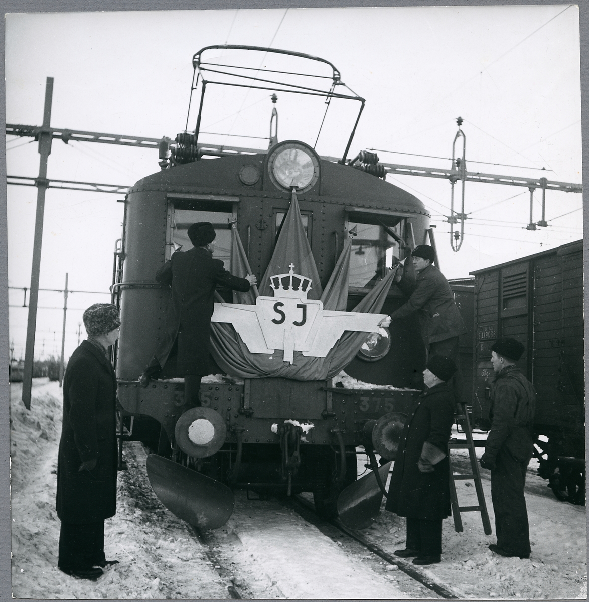 Statens Järnvägar, SJ Dg 375. Loket dekoreras i Bastuträsk. Från invigningen av linjen Långsele - Bodens elektrifiering.