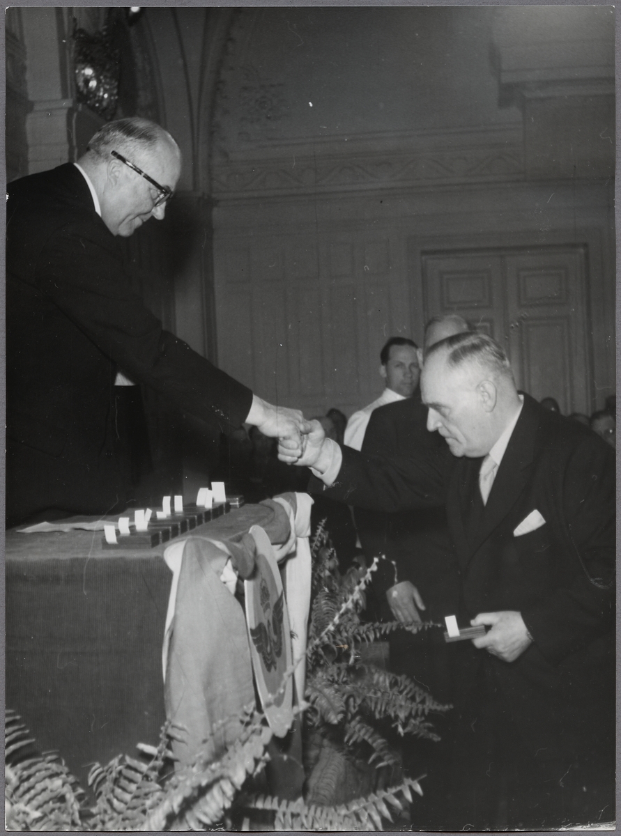 Medaljutdelning med Generaldirektör Gustaf Dahlbeck och Ingenjör Knut Ragnar Holm.