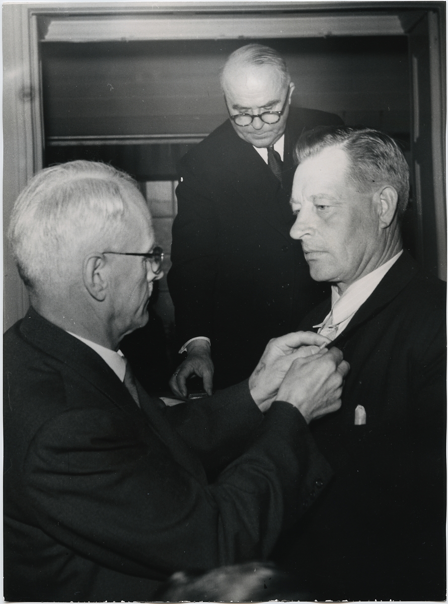 Medaljutdelning till lagbas K.O. Palm med Generaldirektör Gustaf Dahlbeck i bakgrunden.