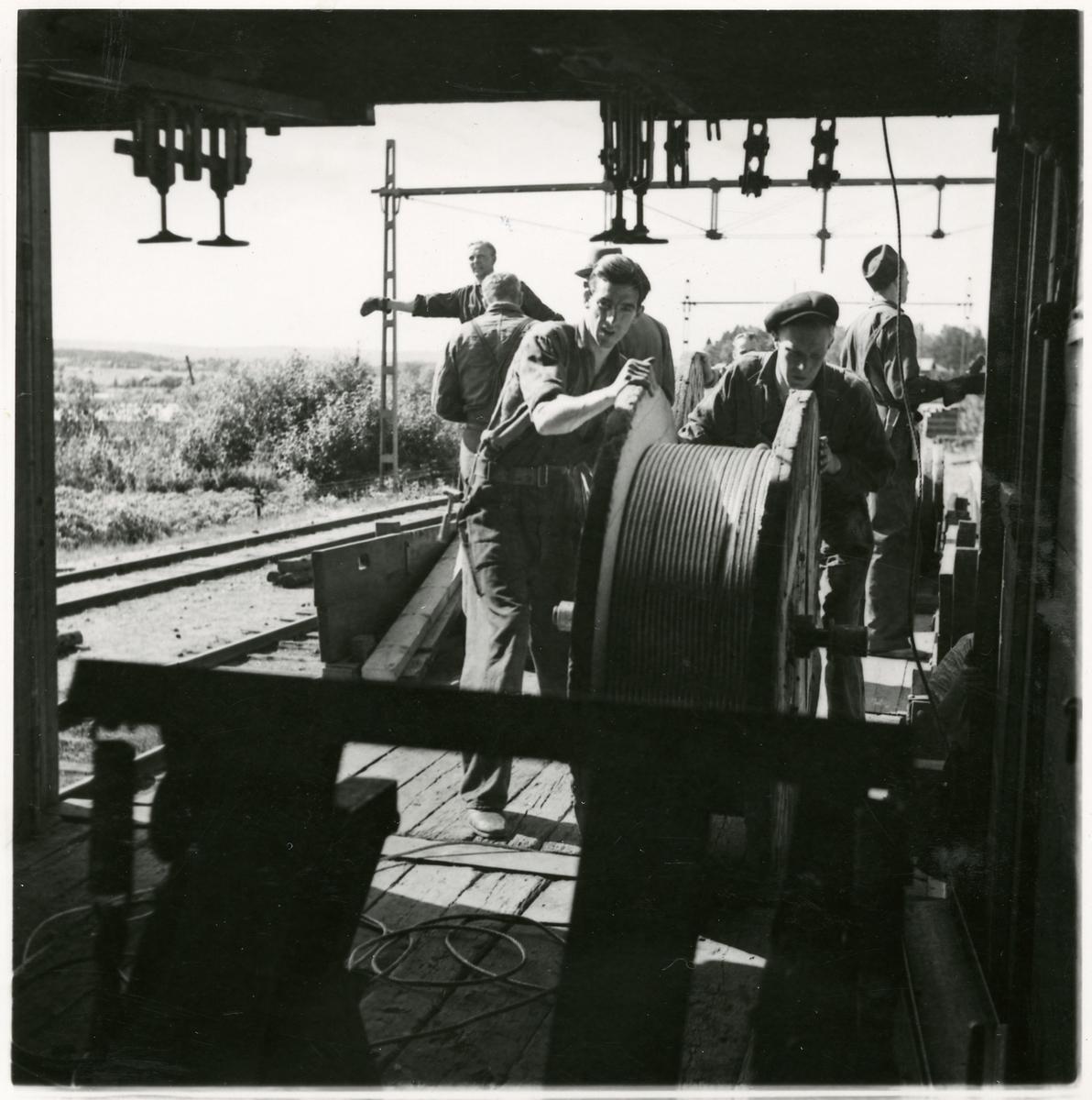 Elektrifieringen av sträckan Ånge - Sundsvall. Inläggning av trådtrumma i utdragningsbock.