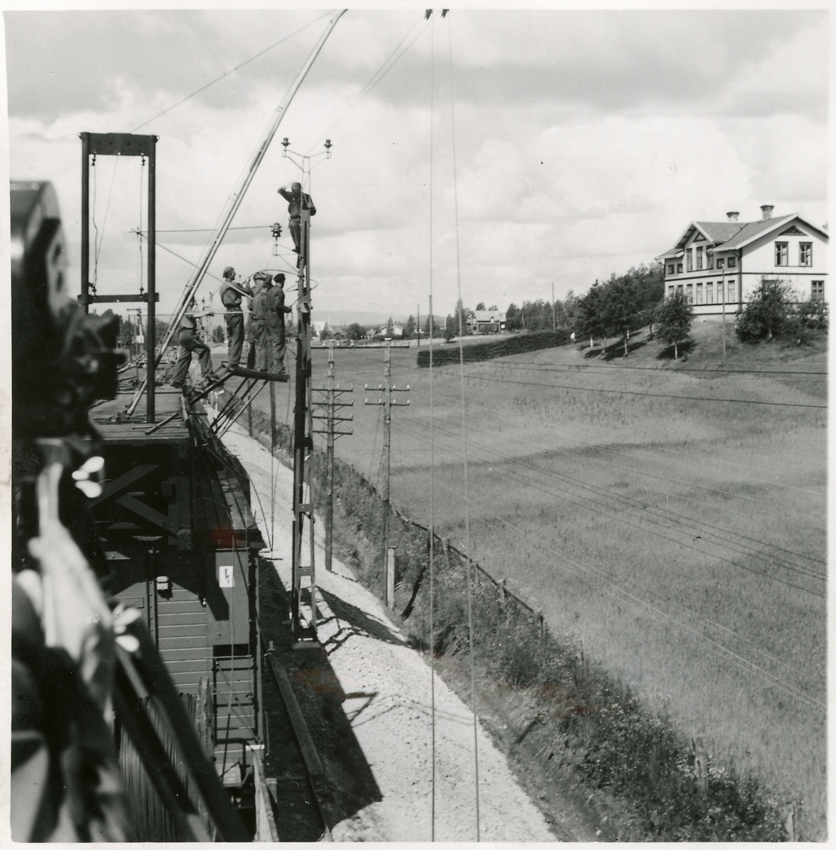 Elektrifieringen av sträckan Ånge - Sundsvall. Trådragningsarbete filmas.