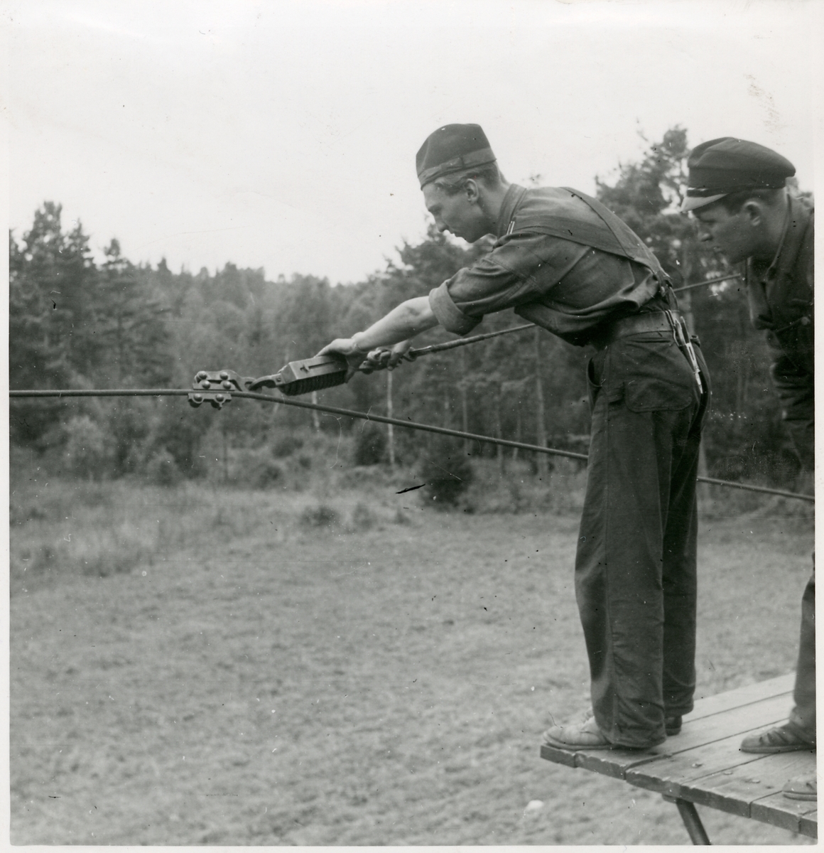 Elektrifieringen av sträckan Helsingborg - Hässleholm. Spänning av lina med fjädervåg.