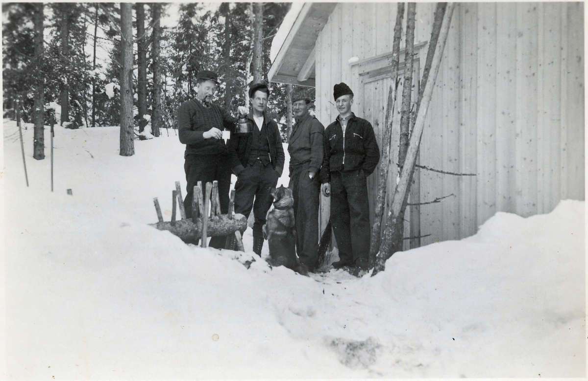 Fikapaus. Långsjö-Pelle med kaffepannan och bredvid honom står Ingemar Aldenby. Hunden Topsy är också med på ett hörn.