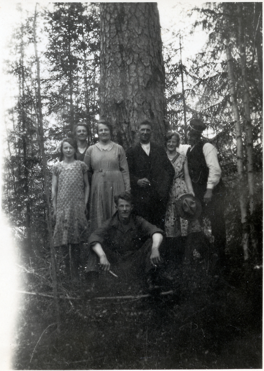 Långsjö-Pelle med familj, från vänster: Ingeborg Andersson, Tekla Andersson, Astrid Andersson, Oskar Rapp, Siri Andersson och Långsjö-Pelle i sin uniformsmössa. Sittandes framför de andra: Ingemar Andersson/Aldenby.