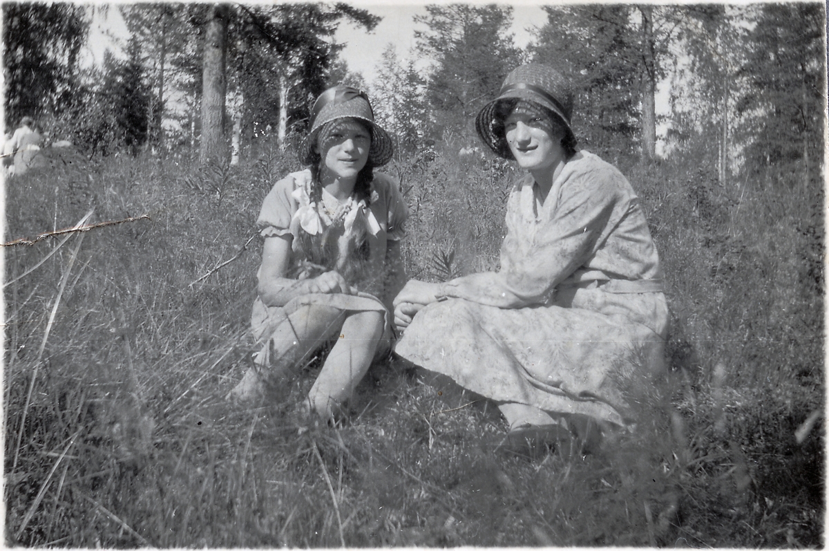 Småjäntorna: syskonen Ingeborg och Siri sittandes i gröngräset iklädda sina fina stråhattar.