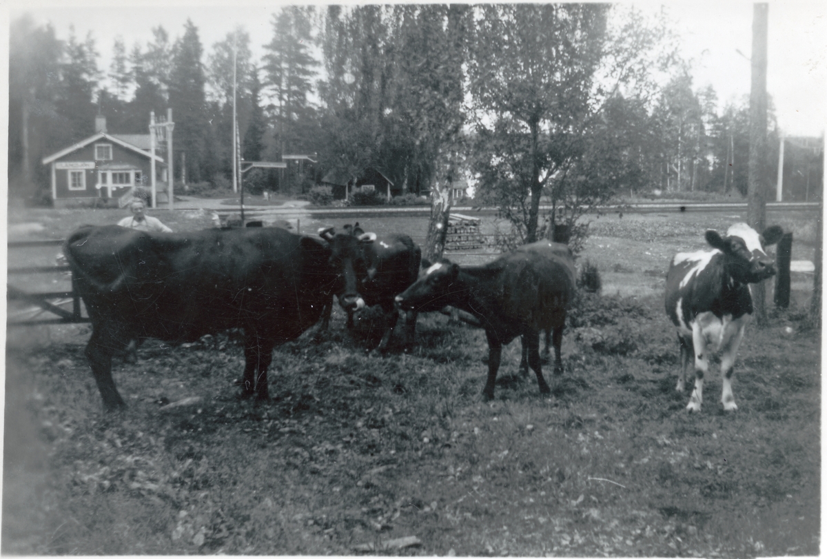 Långsjön station på sträckan Gävle - Falun elektrifierades 1943. På bilden Tekla Andersson med korna. Bakom syns järnvägen och stationshuset.