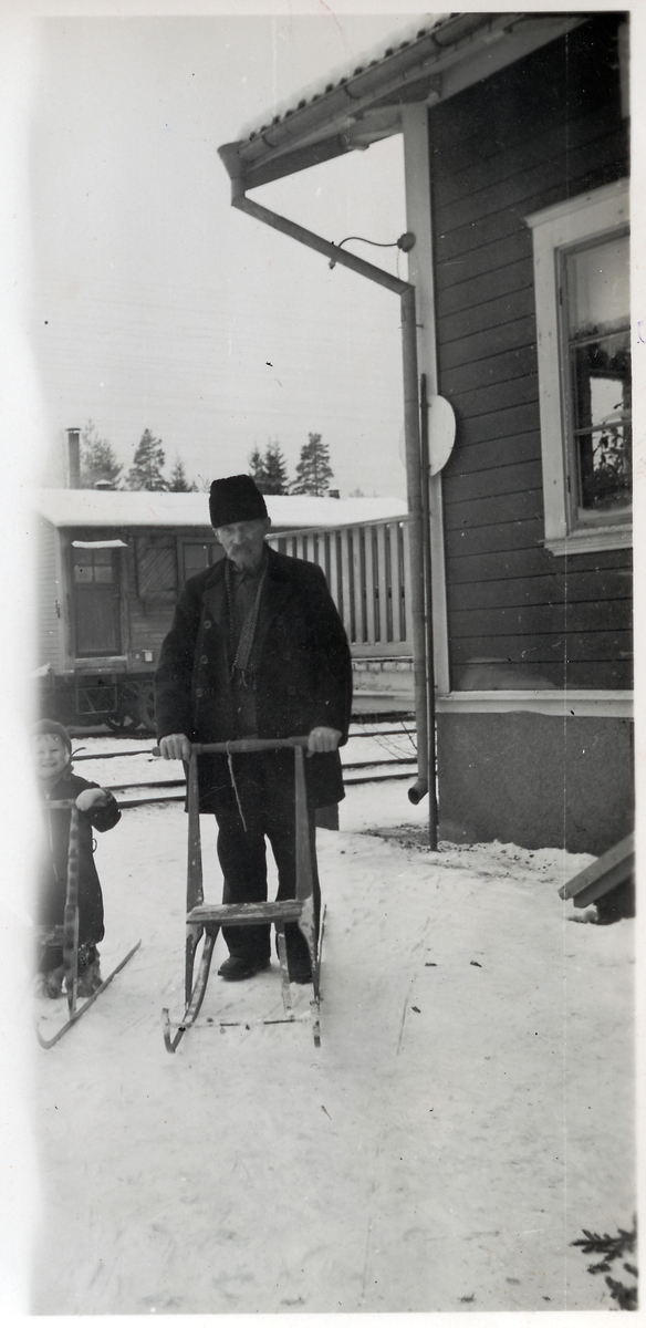 Sparkåkning i Långsjön. Farfar Per Andersson med barnbarnsbarnet Björn Aldenby.