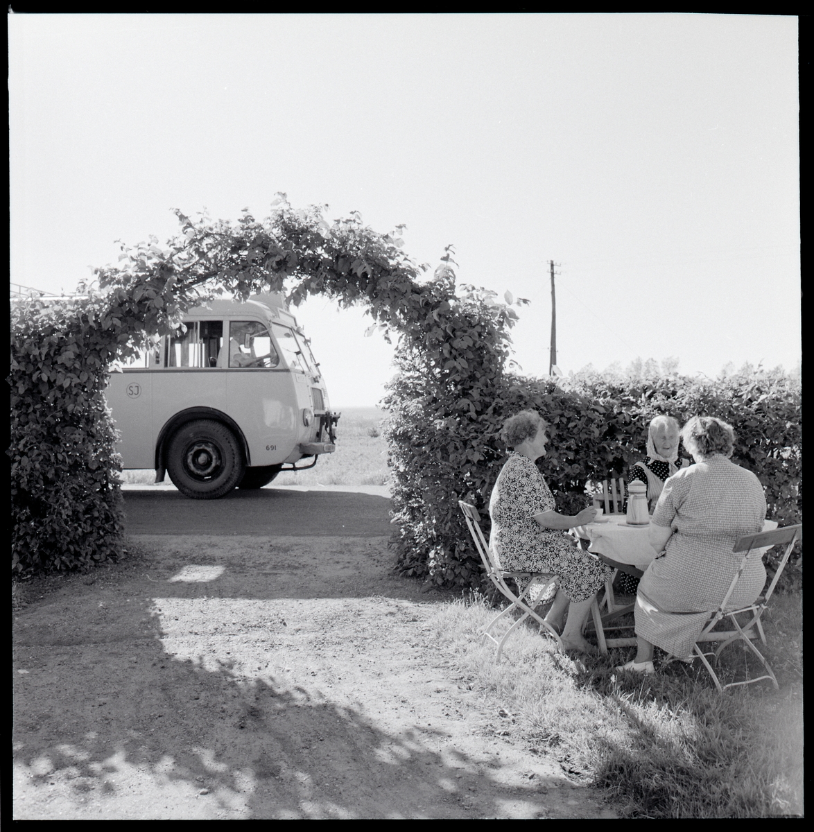 Statens Järnvägar, SJ-buss på landsväg passerar en trädgård med fikande damer.