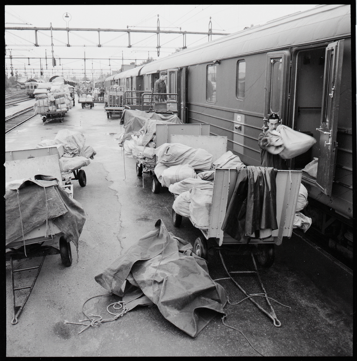 Statens Järnvägar, snälltåg 94 Nordpilen. Resgods- och posthantering. På bilden Överpostiljon Inge Bodin.