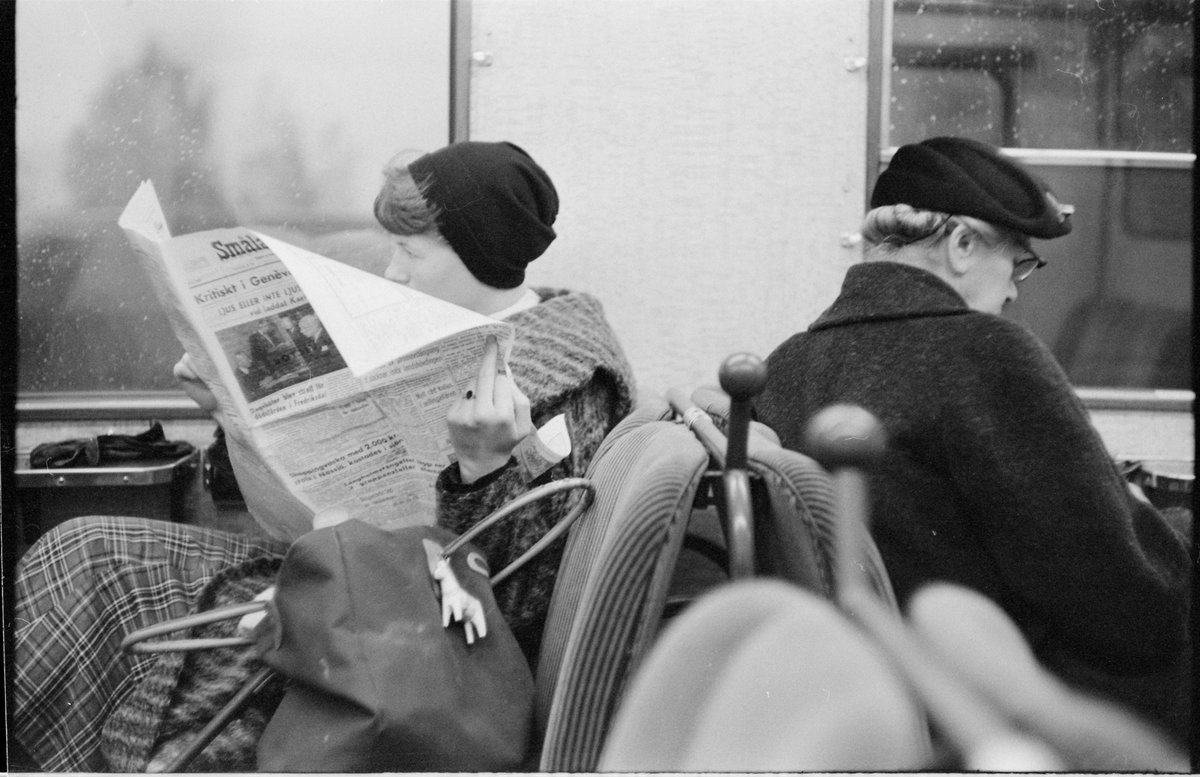 Resenärer i rälsbuss.