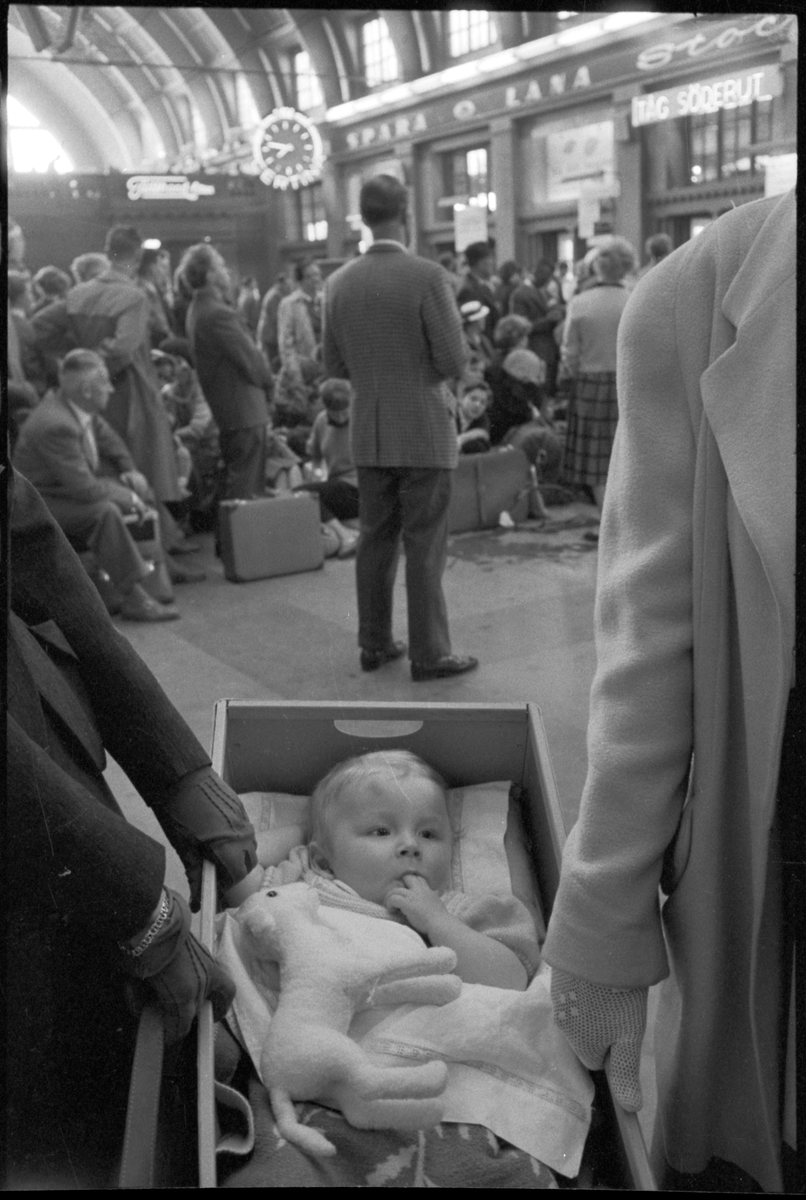 Resenärer väntar på tåg. Fotot taget i höjd med den så kallade "Ringen" mot södra delen av vänthallen. Resturangen skymtar i vänstra övre hörnet.