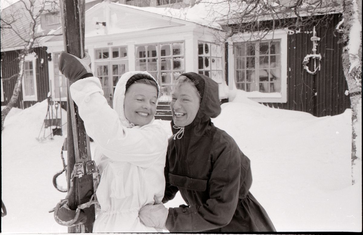 Skidturister utanför en fjällstuga.