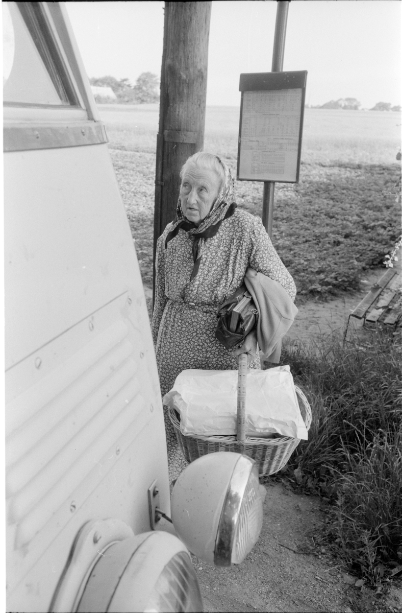 Statens Järnvägar, SJ-Busshållplats och en kvinna med sin packning som ska kliva på den nyanlända bussen.