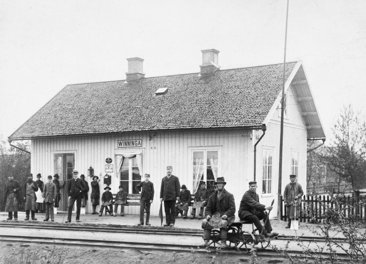 Vinninga , Stationen anlades 1874. Stationshuset, nu tvåvånings putsat, påbyggdes en våning 1920 och expeditionslokalen moderniserades 1940