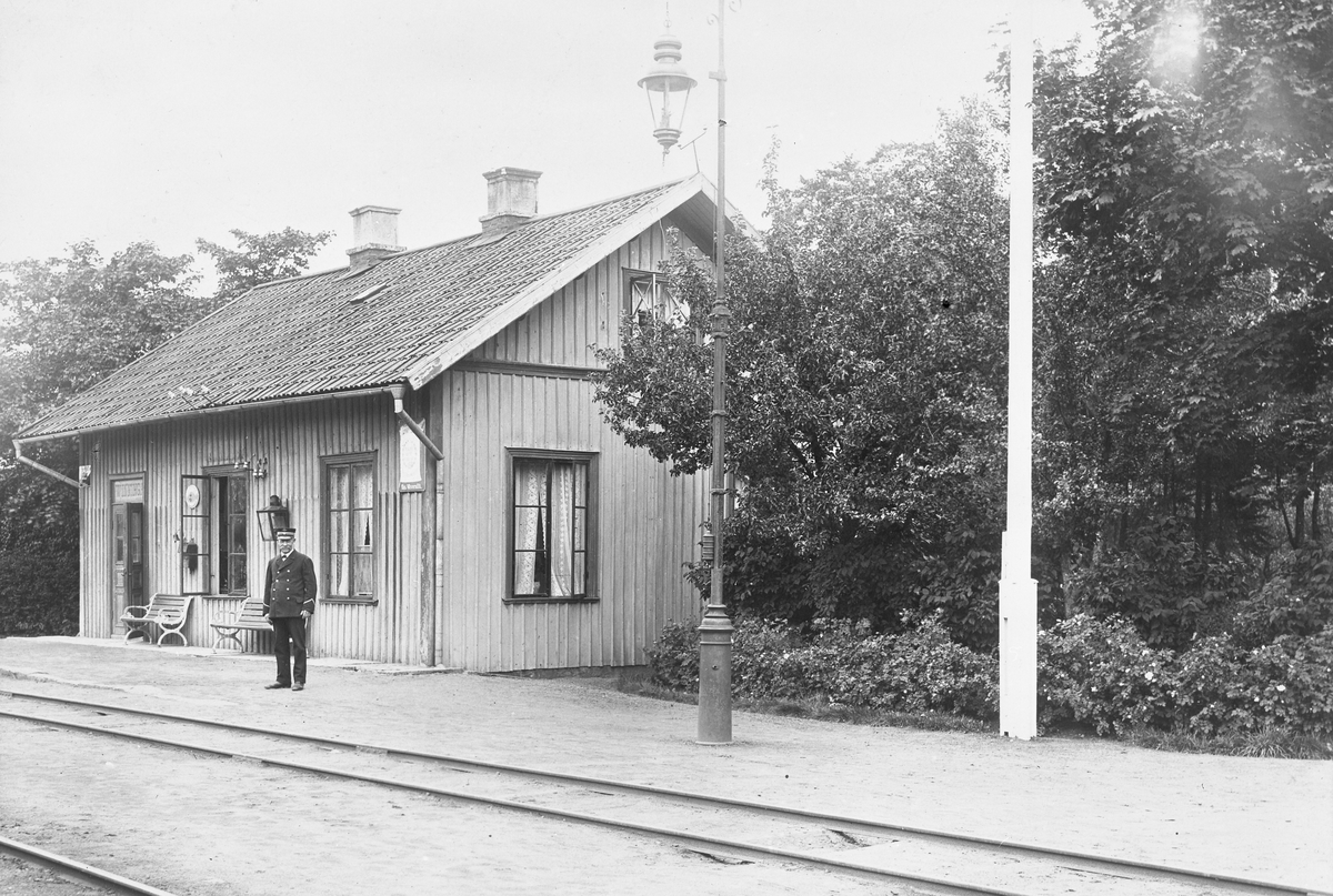 Vinninga , Stationen anlades 1874. Stationshuset, nu tvåvånings putsat, påbyggdes en våning 1920 och expeditionslokalen moderniserades 1940