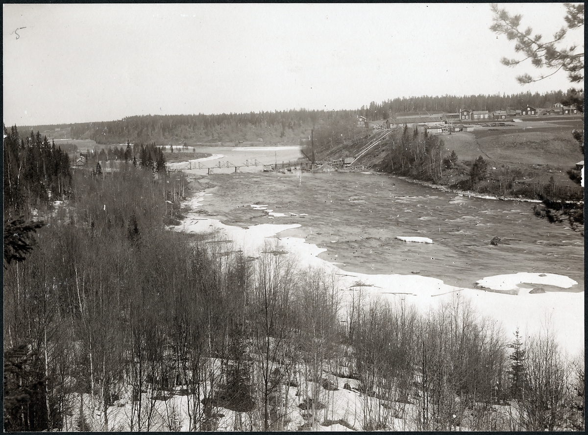 Skellefteälven strax ovanför Skellefteå med omgivningar. I bakgrunden syns bygget av en järnvägsbro på linjen mellan Klutmark och Slind längs statsbanan Bastuträsk-Skellefteå-Skelleftehamn.