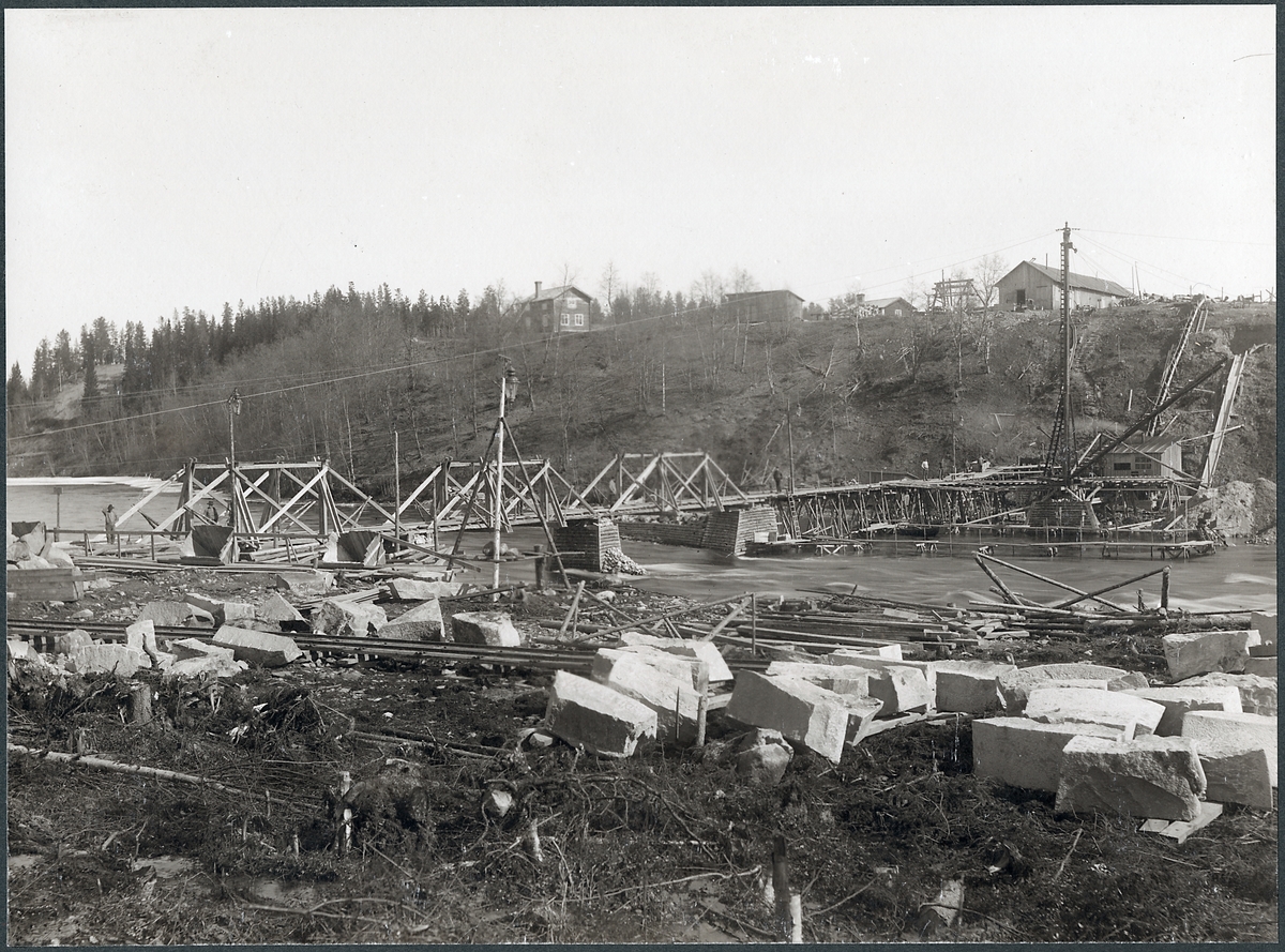 Bygge av bro över Skellefteälven på linjen mellan Klutmark och Slind längs statsbanan Bastuträsk-Skellefteå-Skelleftehamn.