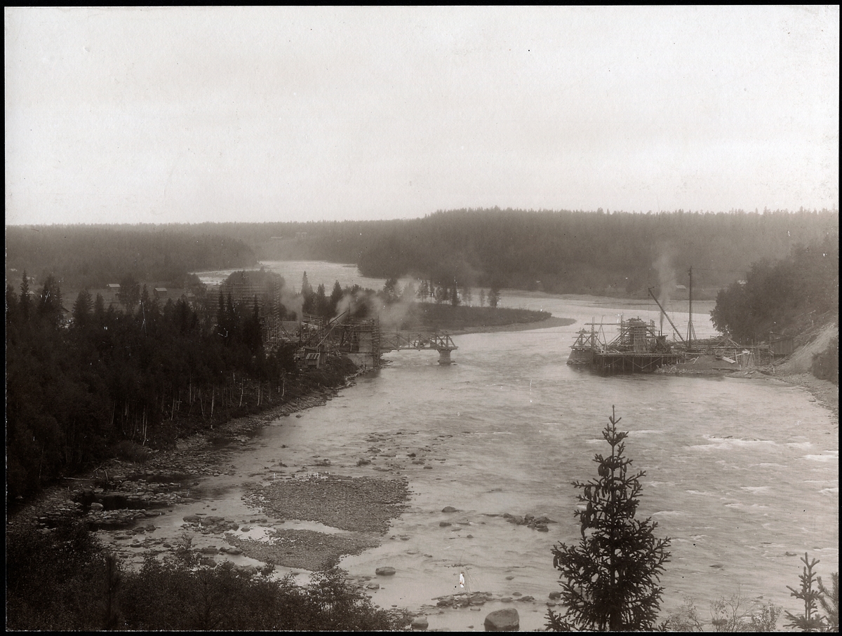 Vy över Skellefteälven med omgivningar. Mitt bild i pågår bygget av järnvägsbron på linjen mellan Klutmark och Slind, längs statsbanan Bastuträsk-Skellefteå-Skelleftehamn.