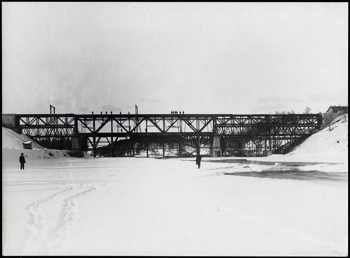 Bygge av bro över Skellefteälven på linjen mellan Klutmark och Slind, då statsbanan Bastuträsk-Skellefteå-Skelleftehamn anlades.