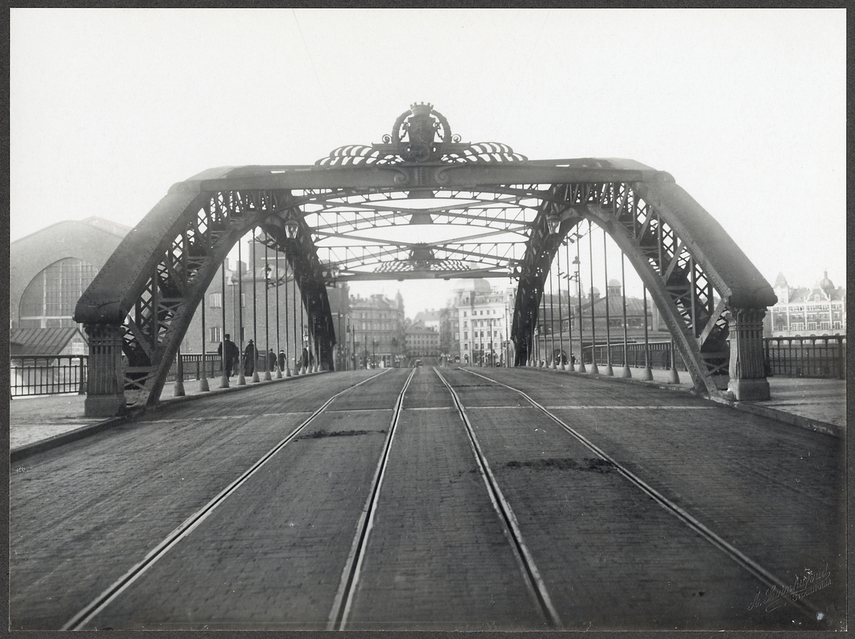 Kungsgatsbron från väster. Centralsaluhallen till vänster i bild, och spår för spårvagnstrafik över Kungsbron. Hötorget bakerst mitt i bild.