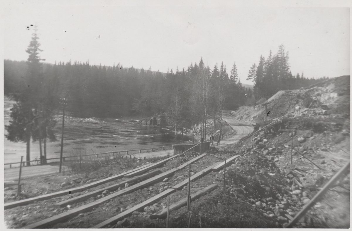 Terasseringsarbete vid "Lugnet" under byggandet Statsbanan Malung-Vansbro. Till vänster i bild ser vi Hovaforsen i Västerdalälven. På linjen mellan driftplats Nordanåker och driftplats Hovafors.