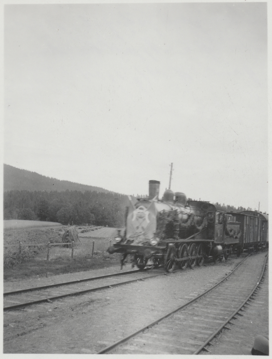 Statens Järnvägar, SJ E Ånglok drog invigningståget för Statsbanan Malung-Vansbro. Här anländer det till Äppelbo på väg mot Malung.