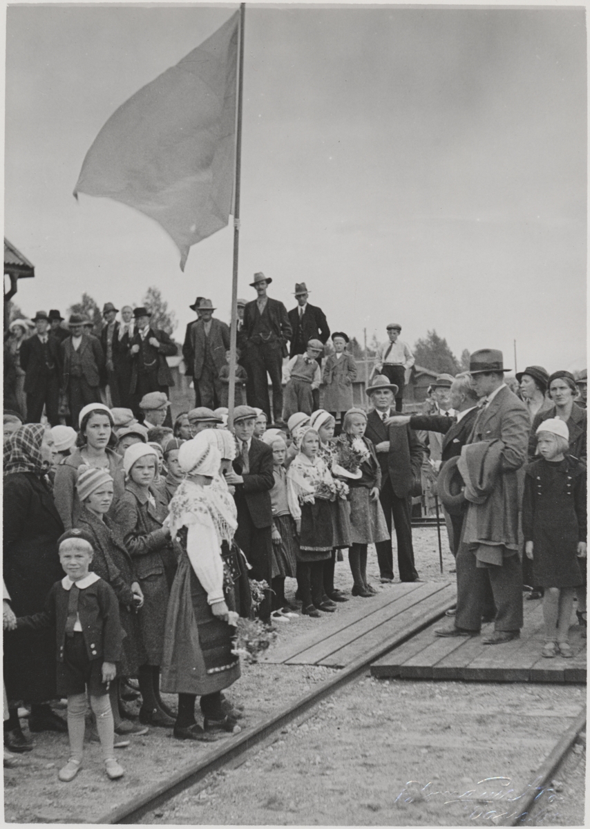 En skolklass närvarar vid invigningen av Statsbanan Malung-Vansbro och sjunger en välkomstsång.