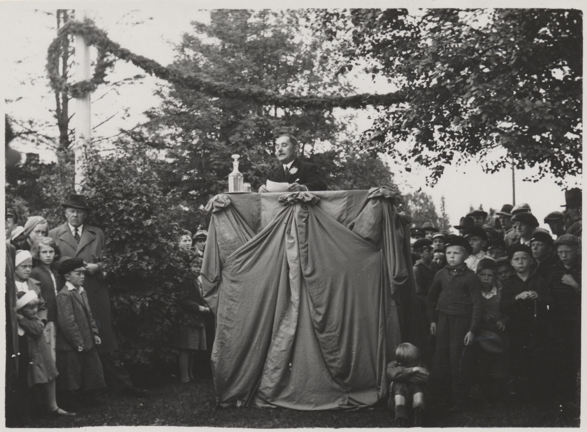 Statsrådet Kommunikationsminster Henning Leo håller tal vid Malungs Station i samband med invigningen av Statsbanan Malung-Vansbro.