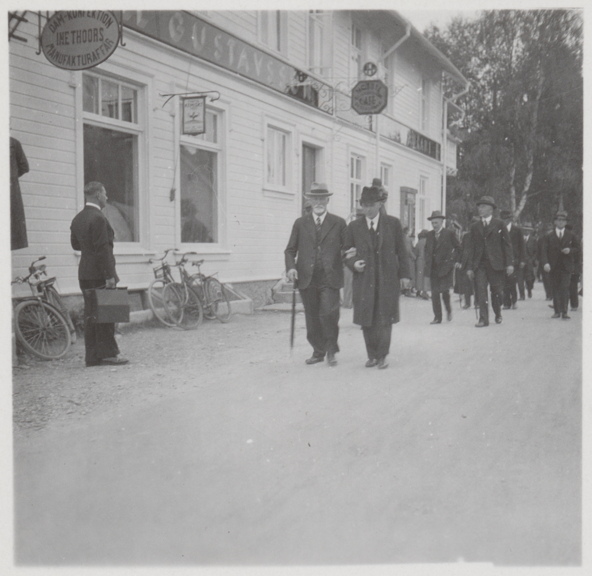 Förre landshövdingen i Kopparbergslän (1922-32) Herman Kvarnzelius på väg mot invigningsmiddagen för Statsbanan Malung-Vansbro som hölls i Malungs biograflokal.