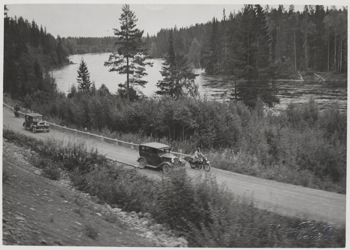 Två bilar och två motorcyklar på landsvägen mellan Vansbro och Malung vid Västerdalälven strax söder om Hovaforsen. Detta under invigningsdagen för Statsbanan Malung-Vansbro.