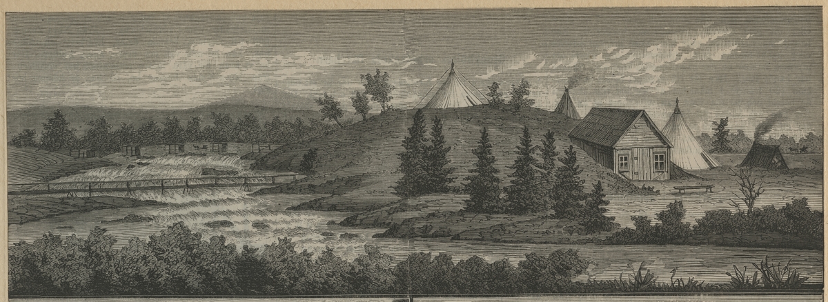 SJs banbyggnad av Linjen Torpshammar- Riksgränsen. (Storlien) Teckning är gjord av järnvägsarbetarna från Jämtland och platsen är "Vid Visjö-ån" som ligger mellan Enafors och Storlien, år 1877.