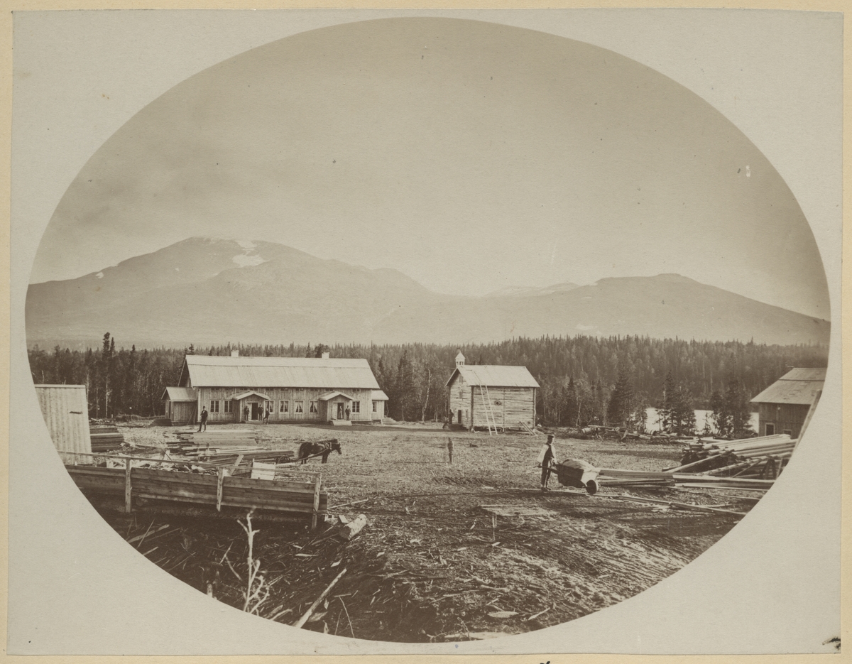 SJs banbyggnad av Linjen Torpshammar- Riksgränsen. (Storlien) Foto är taget i Enaforsholm, år 1875.