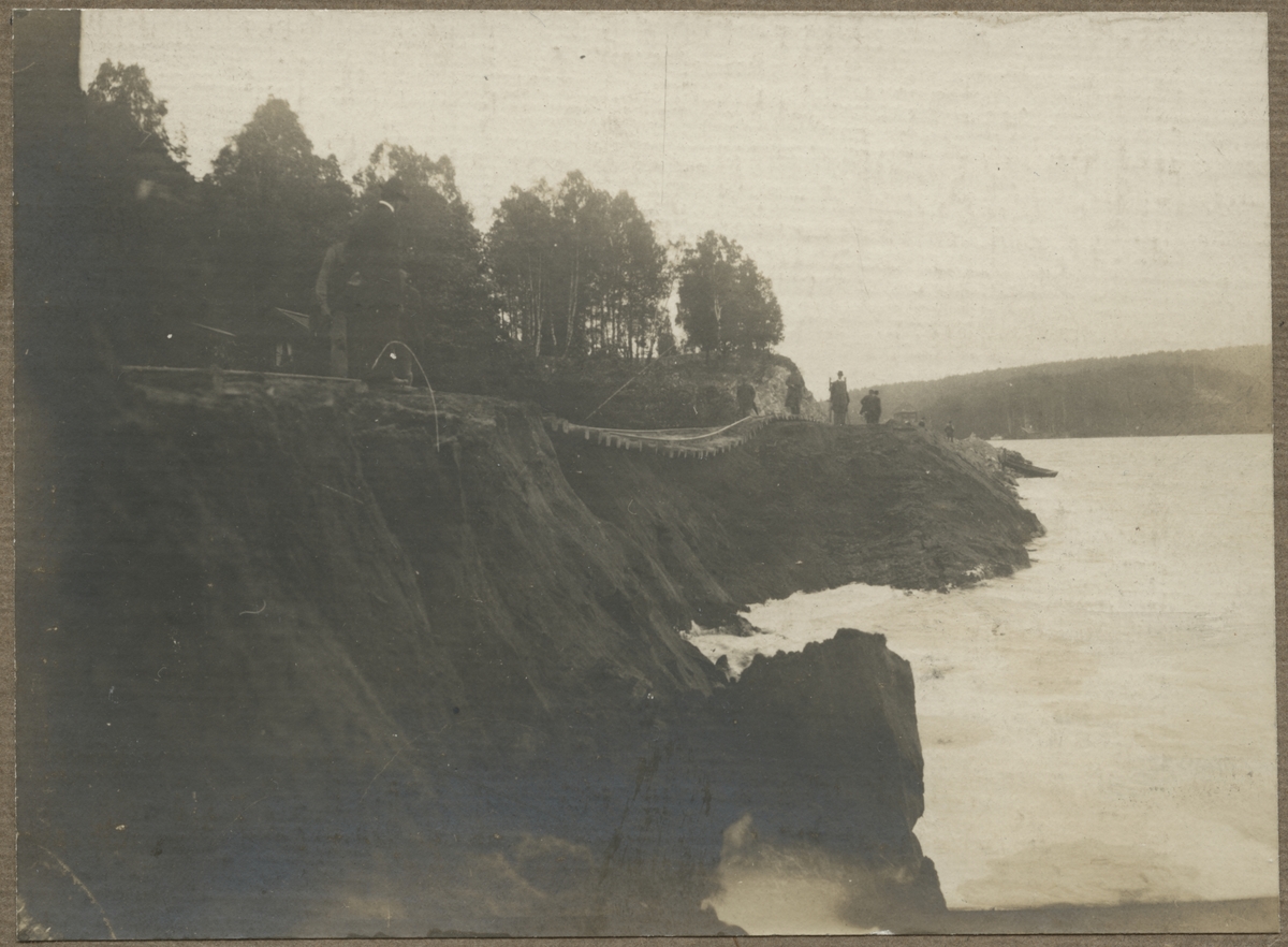 Dubbelspårsbanbyggnad Göteborg - Alingsås. Här ses skadorna efter banksprängningen vid sjön Sävelången, väster om Norsesund, Aug 1916.