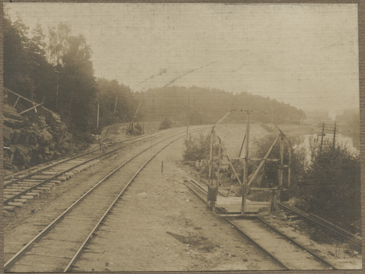 Dubbelspårsbanbyggnad Göteborg - Alingsås. Korsning med gamla stambanan vid sjön "Lilla Sävelången", år 1916.