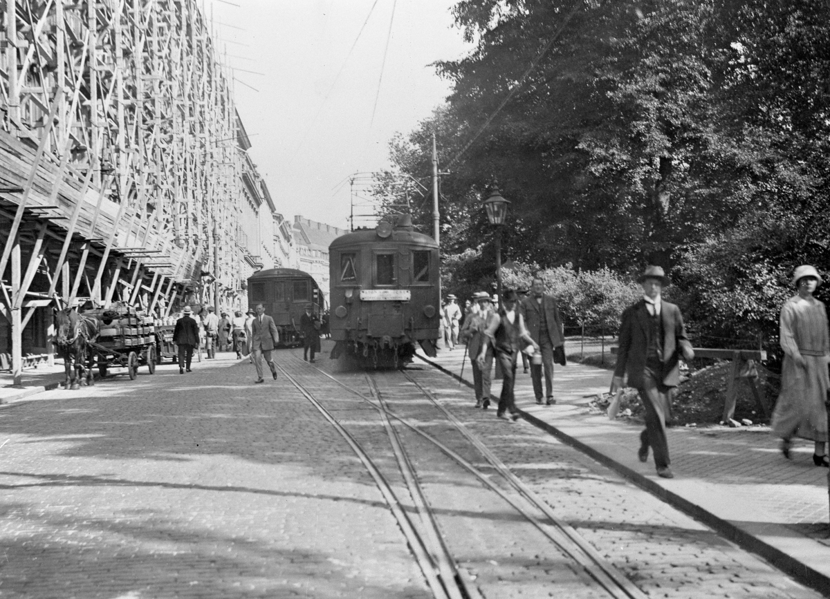 Motorvagn 15 med skylt "Stannar icke mellan Mörby och Stockholm Ö. Till vänster släpvagn 55 (samt en av 68-70 och en motorvagn av 7-14 serien) Rundgång. Pensionsstyrelsens hus Engelbrektsgatan 7 får en påbyggd takvåning.